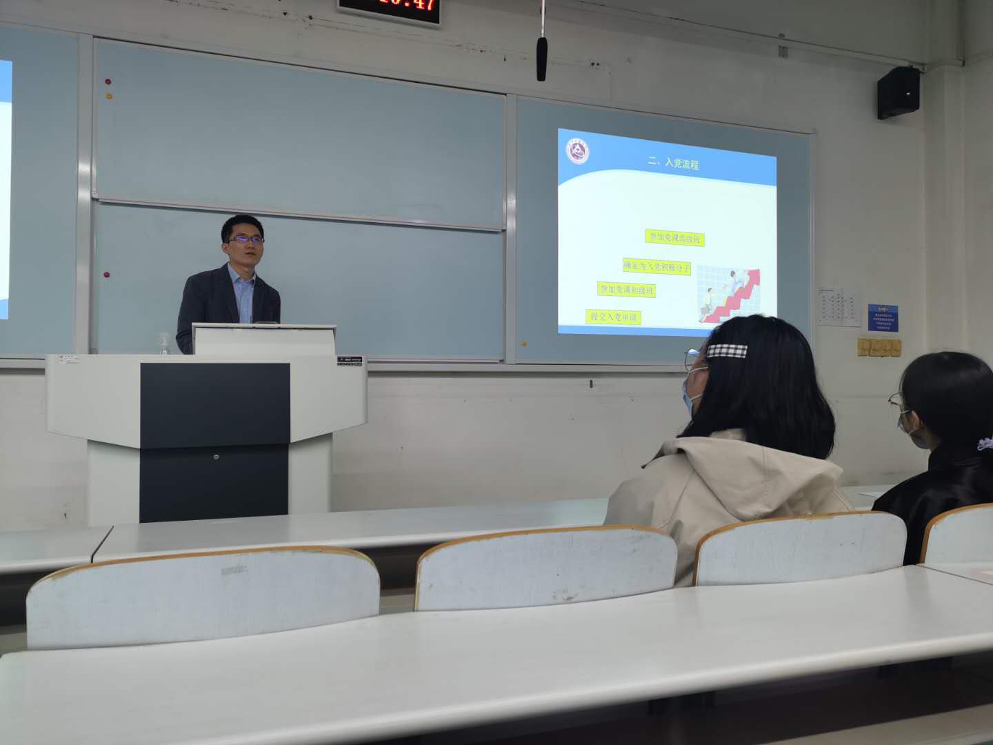 随后,数学本科生党支部书记徐鑫老师详细介绍了入党相关流程,徐老师详细讲解了入党的基本条件、撰写入党申请书的要点、如何规范书写思想汇报、积极分子培养、预备党员发展等方面流程,并现场解答了同学们的问题。