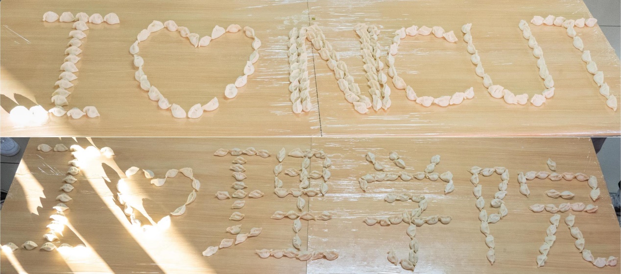 活动现场热火朝天,各小组除了在数量上不甘落后外,大家纷纷巧妙地包出自己心中最美好饺子的形状。包好的饺子还被同学们摆出美丽的图案,大家争相拍照留念。统23-1班彭仁昊同学即兴为本次活动题写《蝶恋花·冬至》一词和横批为《毓秀芳华》的对联一副,同学们用自己擅长的方式不约而同地表达自己的爱院爱校之情。