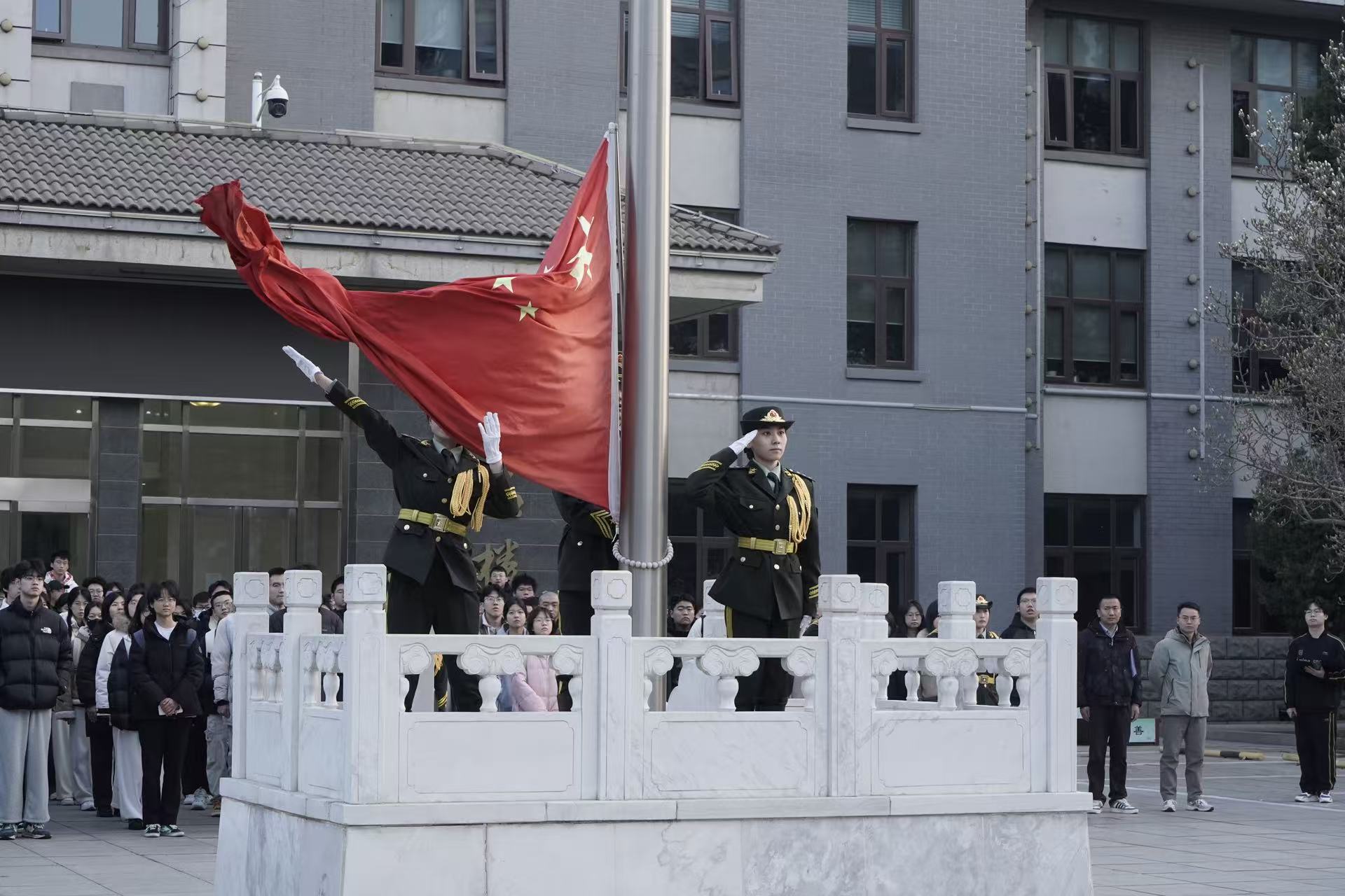 晨光初露,国旗护卫队迈着铿锵有力的步伐护送国旗走向升旗台。伴随着雄壮的《义勇军进行曲》,五星红旗冉冉升起,全体师生肃立行注目礼。