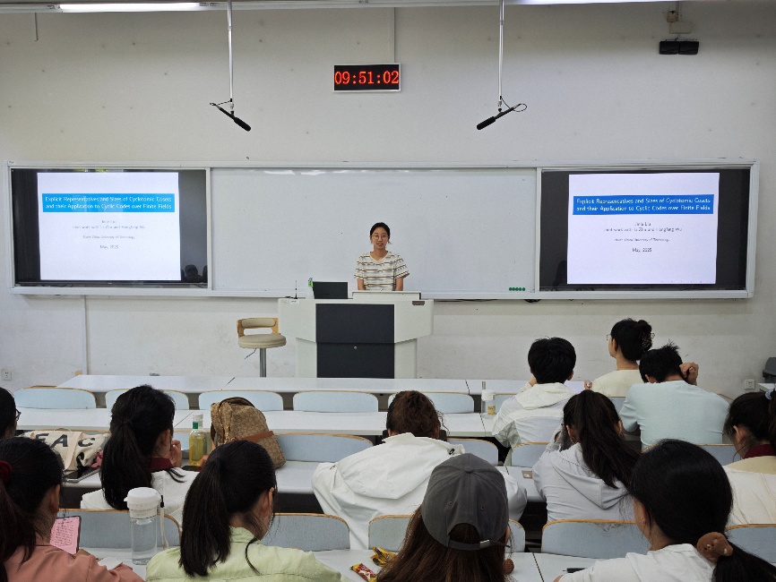 刘金乐同学(数学专业,研究方向:有限域、代数编码)围绕《Explicit representatives and sizes of cyclotomic coset》展开报告,重点分享了q-分圆陪集代表元及长度的显式表达,及她的研究成果在有限域上多项式分解及循环码中一些问题的应用。并在分享中,结合其论文写作经验,交流了学术论文的结构逻辑与表述要点。