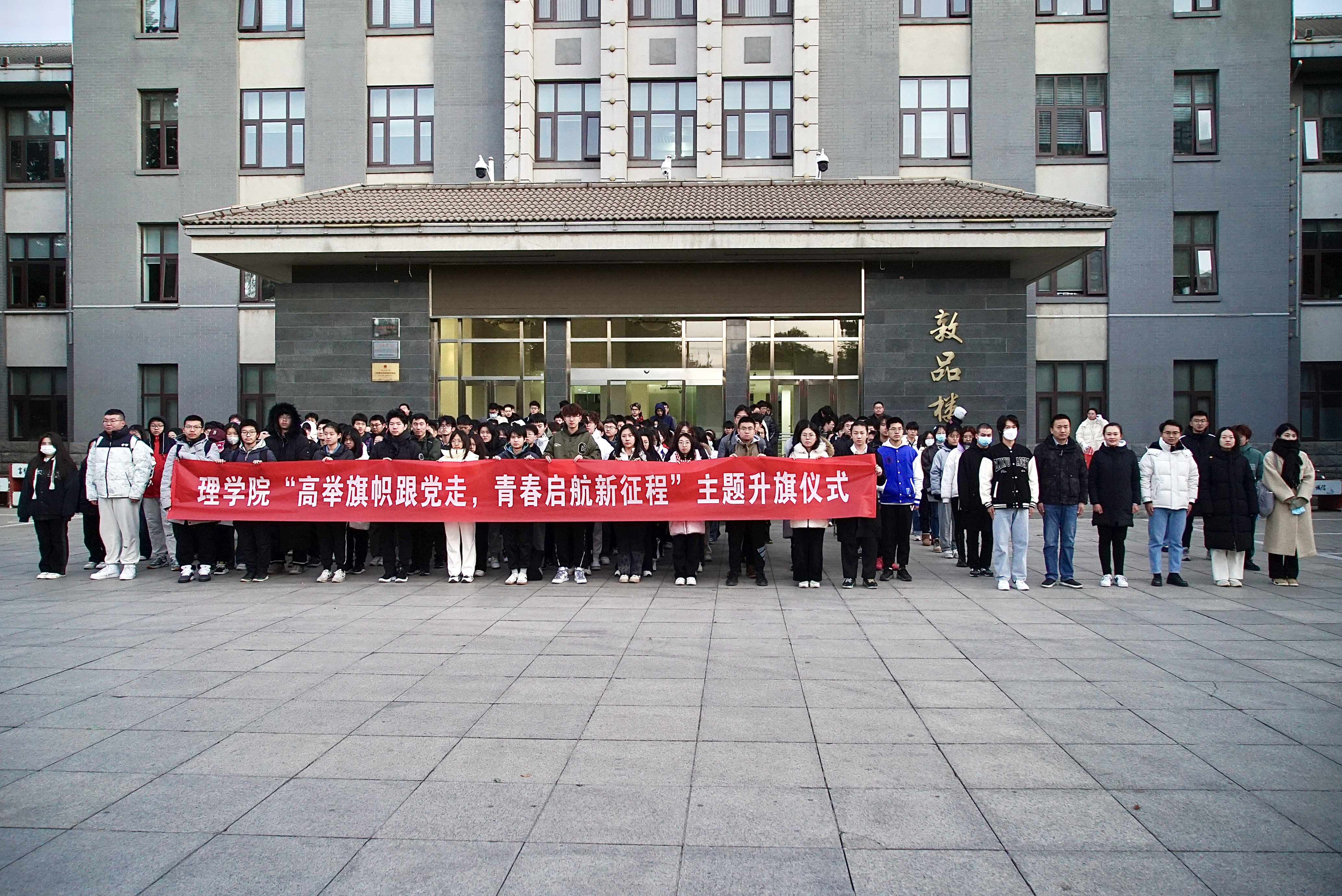 为深入推进新生引航工程,激发学生爱国热情,涵养学生进取品格。11月13日清晨,学院举行“高举旗帜跟党走   青春启航新征程”主题升旗仪式。学院党委副书记贺映勇、院团委书记夏丹梅、全体辅导员、新发展学生党员、团学干部及23级新生共230余人参加了升旗仪式。
