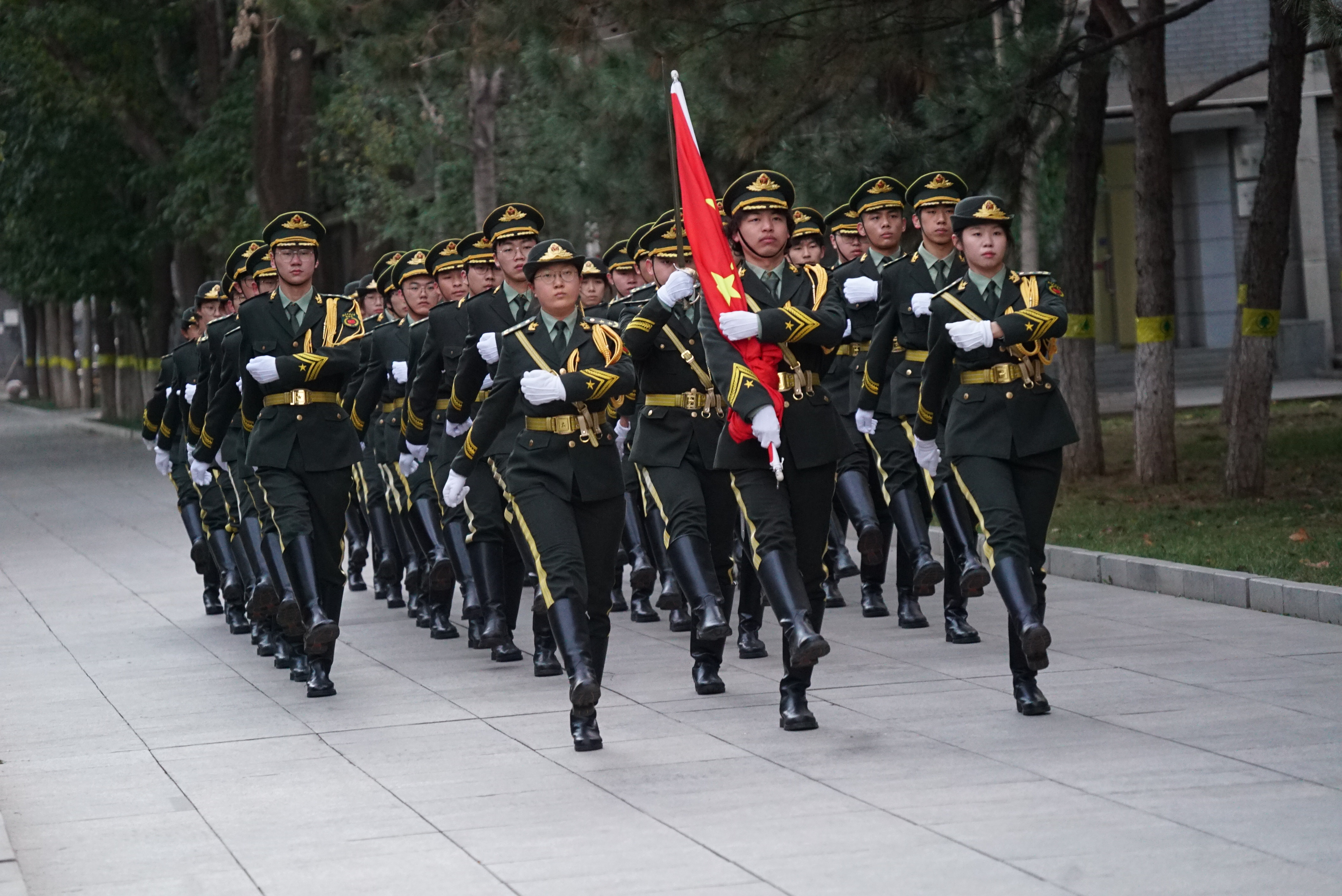 国旗班的同学们迈着整齐划一、铿锵有力的步伐,护送五星红旗正步走向旗杆,全体师生面向国旗肃立致礼。伴随着慷慨激昂的《义勇军进行曲》,师生们注视着五星红旗冉冉升起,在熠熠晨光中迎风飘扬。